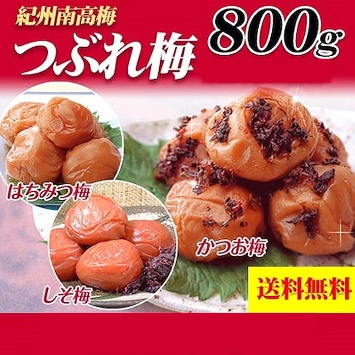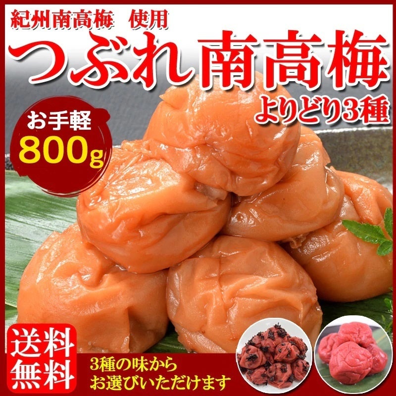 紀州南高梅を使用したつぶれ梅。大容量800gで、はちみつ味、しそ梅、かつお梅の3種類から選べる!