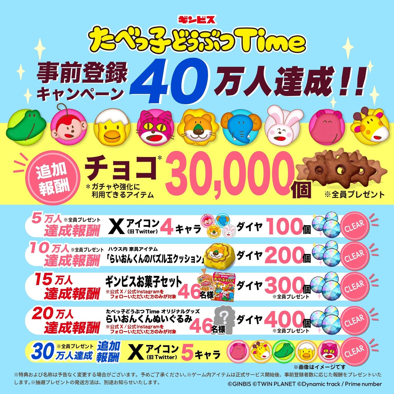『たべっ子どうぶつTime』では、2月13日(火)から3月26日(火)まで、公式SNS(X・Instagram・LINE)のフォローのほかアプリストアで事前登録いただくことでキャンペーンに参加いただける「事前登録キャンペーン」を開催し、その登録者数は40万人を突破いたしました(3月26日(火)現在)。特典として、(アプリ内有料通貨)ダイヤ400個と(アプリ内ハウス用家具アイテム)「らいおんくんのパズル玉クッション」、そして新たに(アプリ内アイテム)チョコ30,000個もアプリ内で全員にプレゼントされます(そのほか抽選プレゼント等あり)。