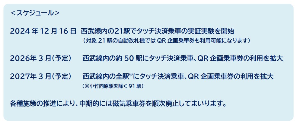 西武鉄道ではお客さまのさらなる利便性向上、シームレスな移動を実現するために、タッチ決済乗車とQR企画乗車券について、2026年3月までに西武線内の約50駅で、2027年3月までには西武線内全駅(小竹向原駅を除く)で利用可能となるように準備を進めてまいります。