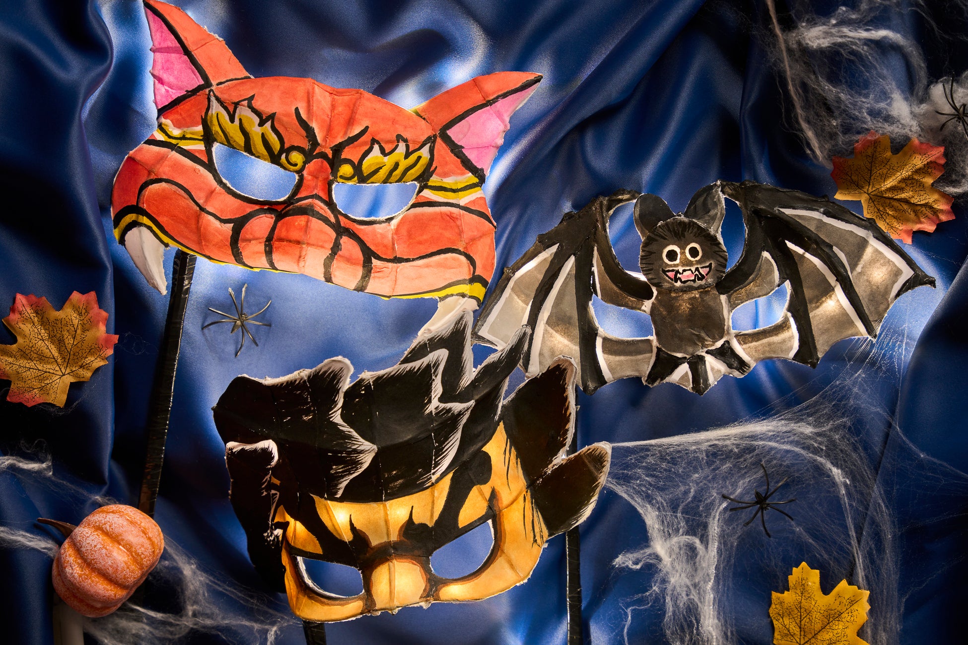 よりハロウィン気分を楽しめるよう、青森ねぶた祭やハロウィンにちなんだ様々な仮装アイテムを用意しています。ハロウィンカラーの跳人衣装に加え、今年は新たに、ねぶたの技法で作られた「ねぶたマスカレードマスク」が登場します。青森県立青森工業高等学校のねぶた部に制作を依頼したオリジナルのものです。青森ねぶた祭の山車の題材としてよく用いられる歌舞伎や神話、鬼などをモチーフにしたものや、ハロウィンらしいコウモリなど、合計12種類ものデザインの中から好きなものを選ぶことができます。青森らしい様々な仮装アイテムを身に着けてねぶたと一緒に写真を撮ることができます。
