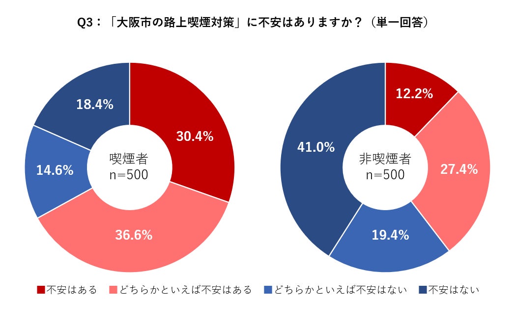 「大阪市の路上喫煙対策」に対して、「不安」(「不安はある」と「どちらかというと不安はある」の合計)と回答した人の割合は、喫煙者は67.0%(不安はある:30.4%+どちらかといえば不安はある:36.6%)、非喫煙者では39.6%(不安はある:12.2%+どちらかといえば不安はある:27.4%)でした。喫煙者では、約3人に2人が何らかの不安を抱えている実態が明らかになりました。