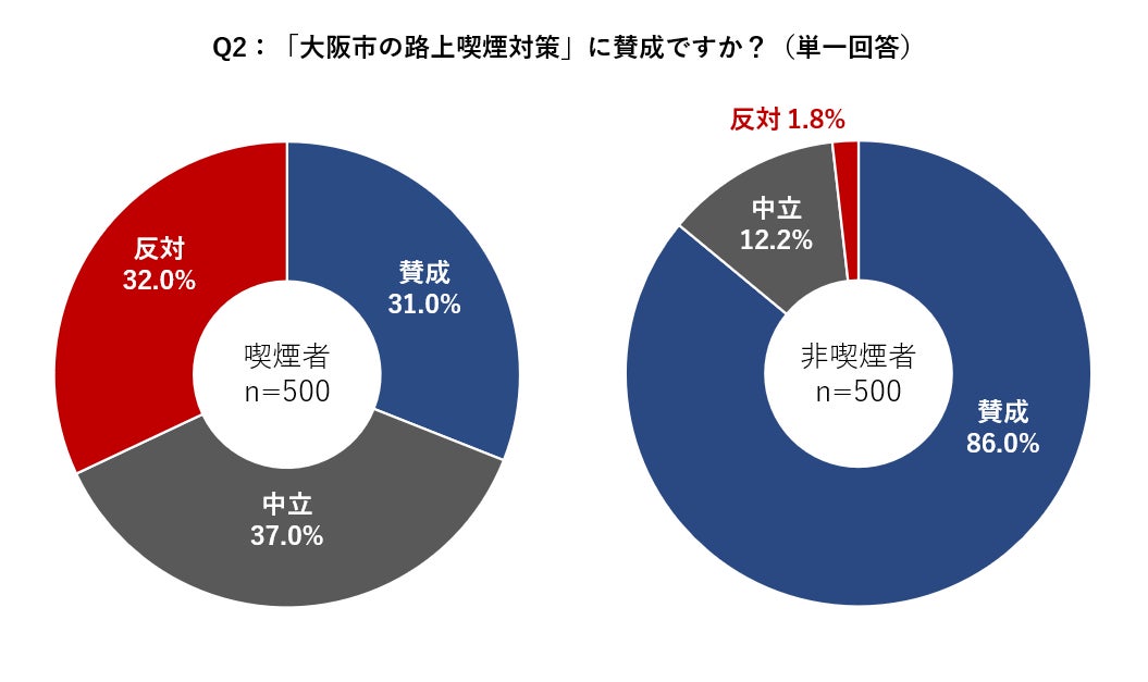大阪市内全域の路上喫煙禁止に対する生活者意識を調査。喫煙者の3人に1人、非喫煙者の2人に1人が「大阪市全域の路上喫煙禁止」を知らない。賛成派、喫煙者では31.0%、非喫煙者では86.0%と大きく乖離。