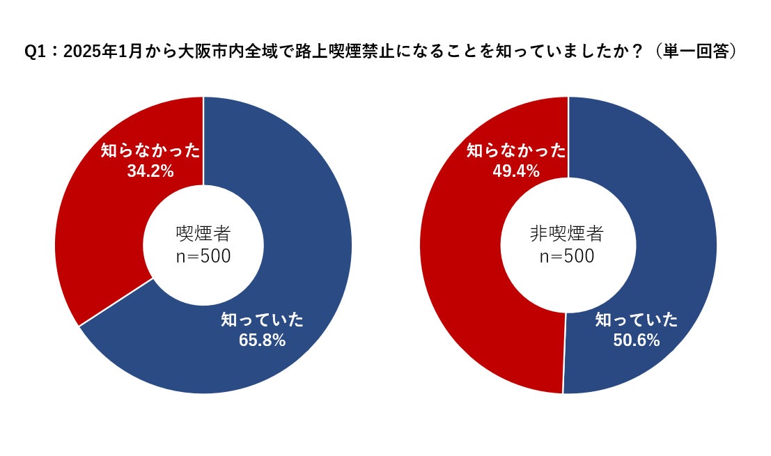 この「大阪市の路上喫煙対策」を知っているかを大阪市内の生活者に対して、たばこを吸う習慣がある人(以下、「喫煙者」)と、たばこを吸う習慣がない人(以下、「非喫煙者」)、それぞれに尋ねました。喫煙者で「知らなかった」と回答した人の割合は34.2%で約3人に1人、非喫煙者では49.4%で約2人に1人という結果でした。条例改正を約1カ月後に控えていることを鑑みると、認知率は不十分だと言えそうです。
