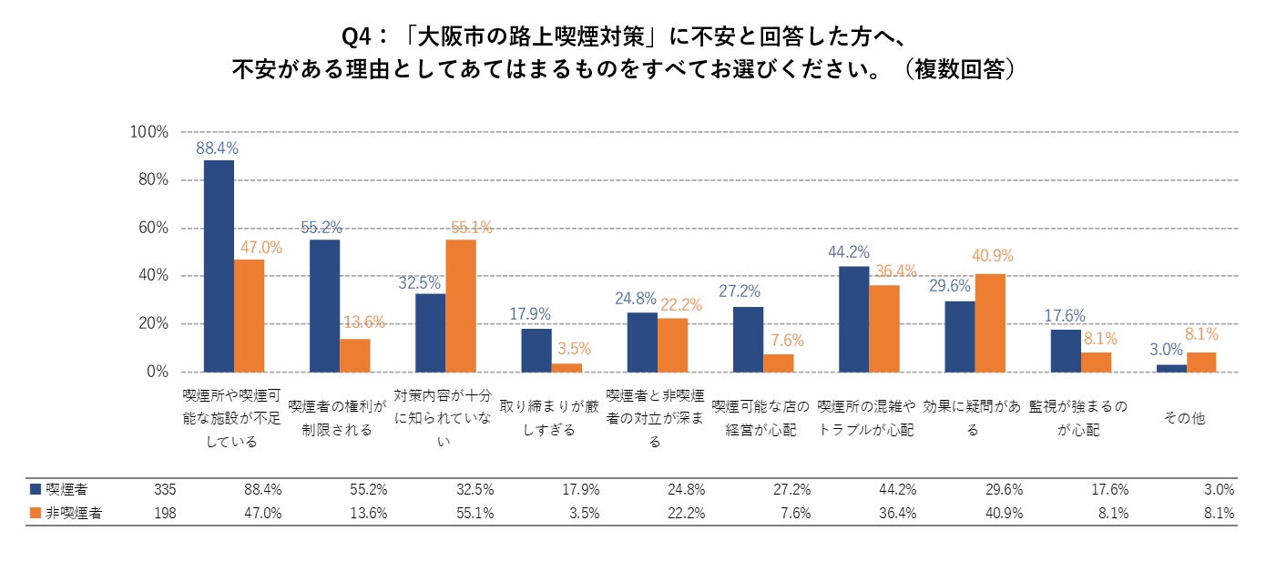 続いて、不安の理由を尋ねたところ、喫煙者で最も多かった回答は「喫煙所や喫煙可能な施設が不足している」で88.4%となり、10人中9人もの喫煙者が喫煙場所の不足を不安視していることが分かりました。また非喫煙者では、「対策内容が十分に知られていない」が最も多い回答で55.1%でした。非喫煙者に対しては、「大阪市の路上喫煙対策」に関する情報を今まで以上に発信していく必要性が示唆されました。