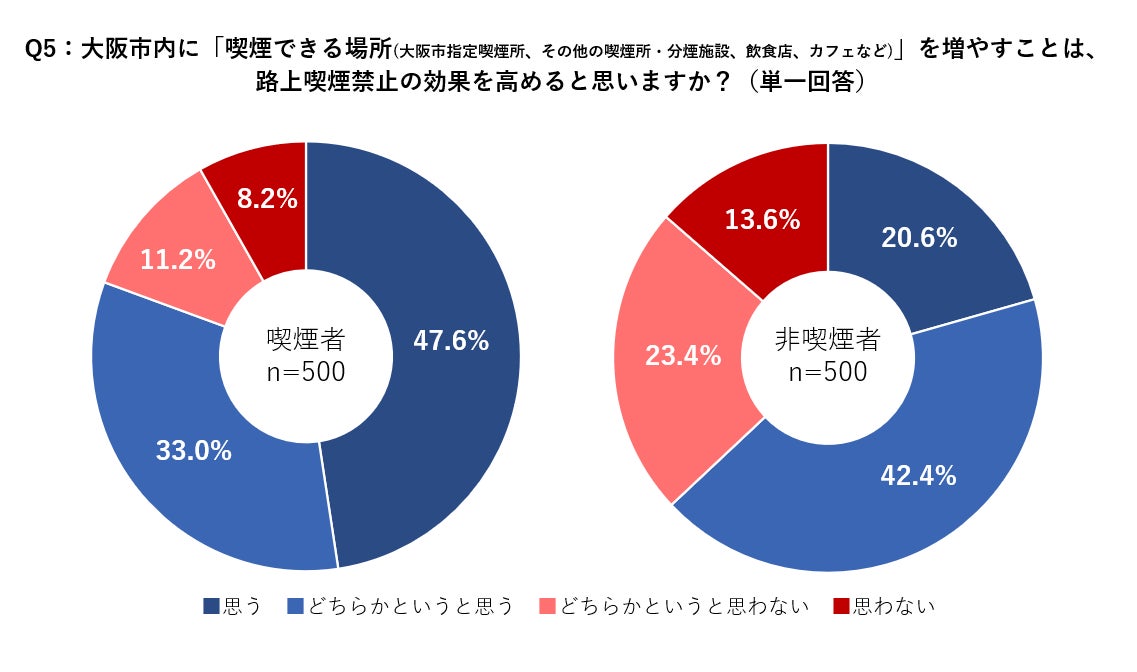 「大阪市の路上喫煙対策」を前に、大阪市は「大阪市指定喫煙所」(公園、商業施設内の喫煙所)の開設を発表していました。その「大阪市指定喫煙所」を含め、喫煙所・分煙施設、飲食店、カフェといった「喫煙できる場所」を増やすことは、路上喫煙禁止の効果を高めると思うかという質問に対して、喫煙者に絞った場合の「思う」という回答割合(「思う」と「どちらかというと思う」の合計)は80.6%(思う:47.6%+どちらかというと思う:33.0%)、非喫煙者では63.0%(思う:20.6%+どちらかというと思う:42.4%)と、全体として喫煙できる場所を増やすことは「大阪市の路上喫煙対策」の効果を高めることに寄与できることが示唆されました。