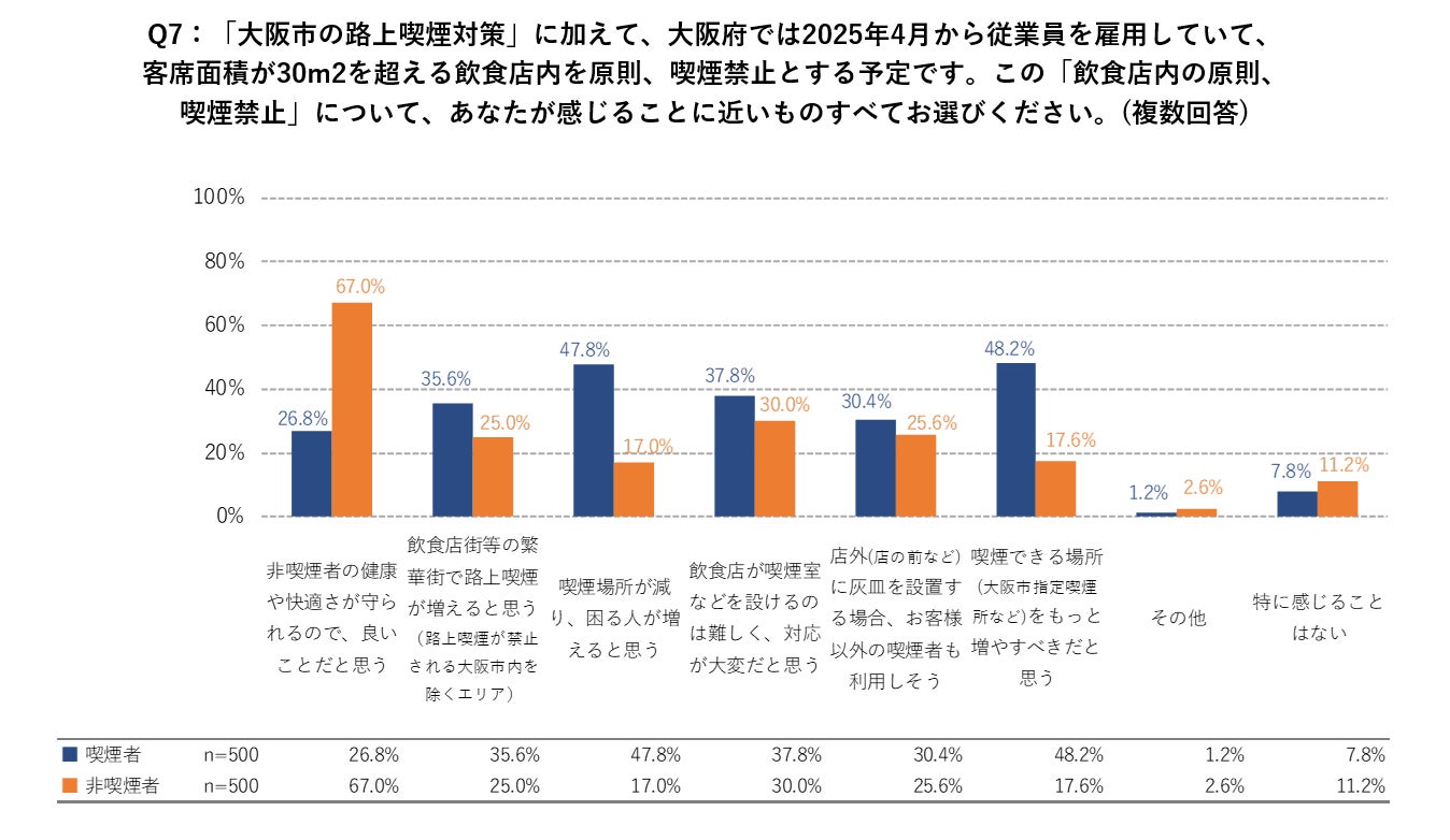 その結果、喫煙者で最も多い回答は「喫煙できる場所 (大阪市指定喫煙所など)をもっと増やすべきだと思う」で48.2%、次に多い回答は「喫煙場所が減り、困る人が増えると思う」で47.8%でした。喫煙者の約2人に1人が喫煙できる場所が減ることを懸念していることが分かる結果でした。