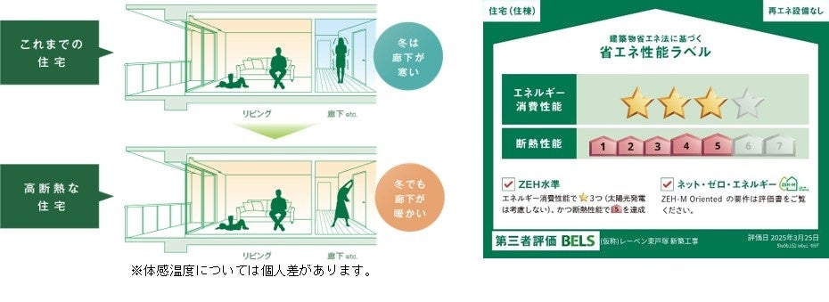 また、「BELS(ベルス)」による第三者認証で3つ星を取得しており、快適な住まいで家族の健やかな生活をサポート。24時間お部屋の空気を新鮮に保つ換気システム、冬は暖かく、夏はエアコンに頼りすぎない暮らしを実現するZEHマンションで、日々の暮らしを豊かに楽しみながら、持続的に脱炭素活動が行える先進的な仕様となっています。