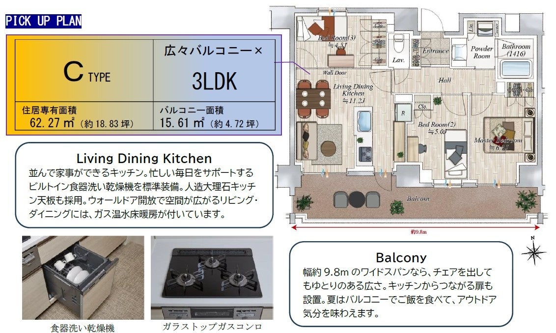 全邸南向き・2LDK47㎡超~3LDK62㎡超の5タイプ