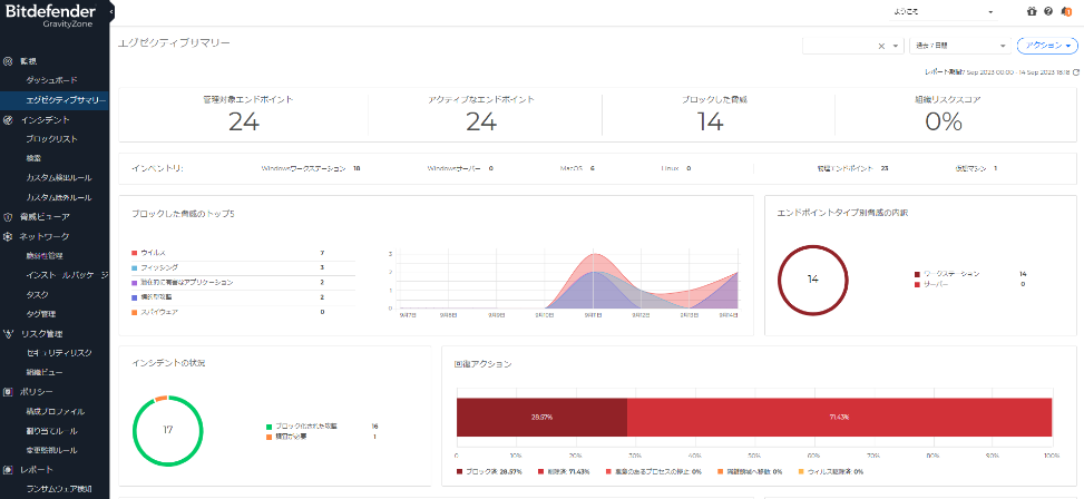 社内外にあるすべての端末を1つのコンソールで管理できます。脅威が見つかった場合も迅速に対応できます。また、ライセンス契約している台数も、同じ画面で管理でき、PCの台数の増減時や更新などの管理も負担が少なくて済みます。