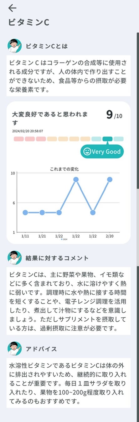 主に直近の食事状況による栄養状態を測定するため、「普段の食事で栄養が足りているか」、「サプリメントを飲んでいるが栄養を摂れているか」といったお悩みや、「最近、なんだか調子が良くない」といった、ちょっとしたカラダの不調の原因を解決する手助けとなります。毎回の検査結果はアプリ内に保存されるので、生活改善後に再び検査をし、前の結果と比べることで、食事やサプリメント、運動の効果を確認することも可能です。