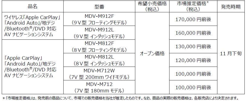 株式会社JVCケンウッドは、KENWOODブランドより、高精細HDパネルを搭載する、AVナビゲーションシステム“彩速ナビ”の最上位シリーズ「TYPE M」の2025年モデルとして、「MDV-M912F」(9V型 フローティングモデル)、「MDV-M912L」(9V型 インダッシュモデル)、「MDV-M812F」(8V型 フローティングモデル)、「MDV-M812L」(8V型 インダッシュモデル)、「MDV-M712W」(7V型 200mmワイドモデル)、「MDV-M712」(7V型 180mmモデル)の計6モデルを11月下旬より発売します。