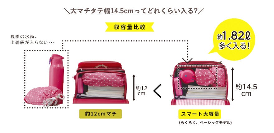 マチが約14.5cmもあり、約1.82Lの容量が収容できます。水筒や上靴袋など大きな荷物もまとめてすっぽり収容できます。