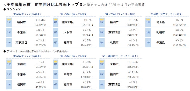 <2025年4月 全国主要都市における賃貸マンション・アパートの平均家賃(面積帯別)>