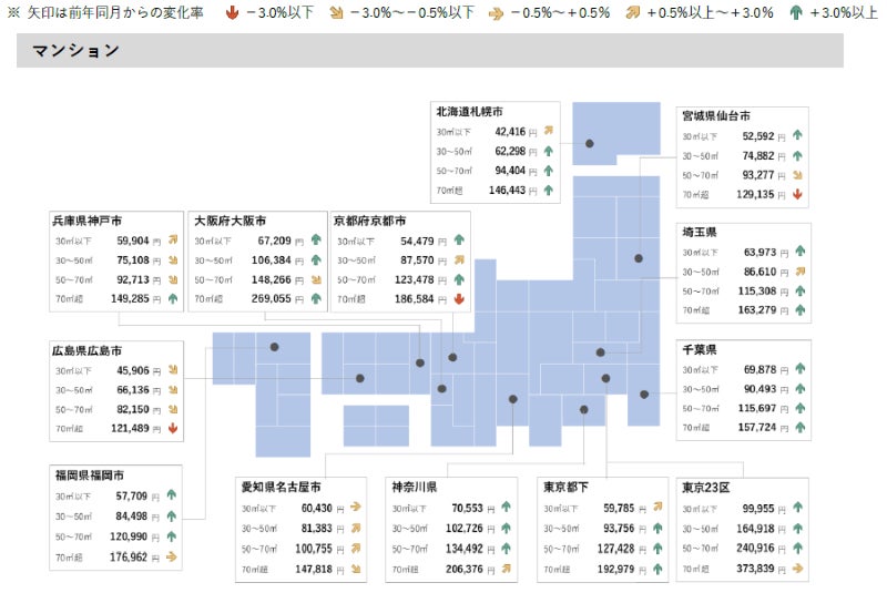 ●マンションは、カップル向きが神戸市・広島市を除く11エリアで前年同月を上回る。中でも、東京23区・神奈川県・埼玉県・千葉県・仙台市・大阪市の6エリアで2015年1月以降最高値を更新。東京23区の最高値更新は29カ月連続に。