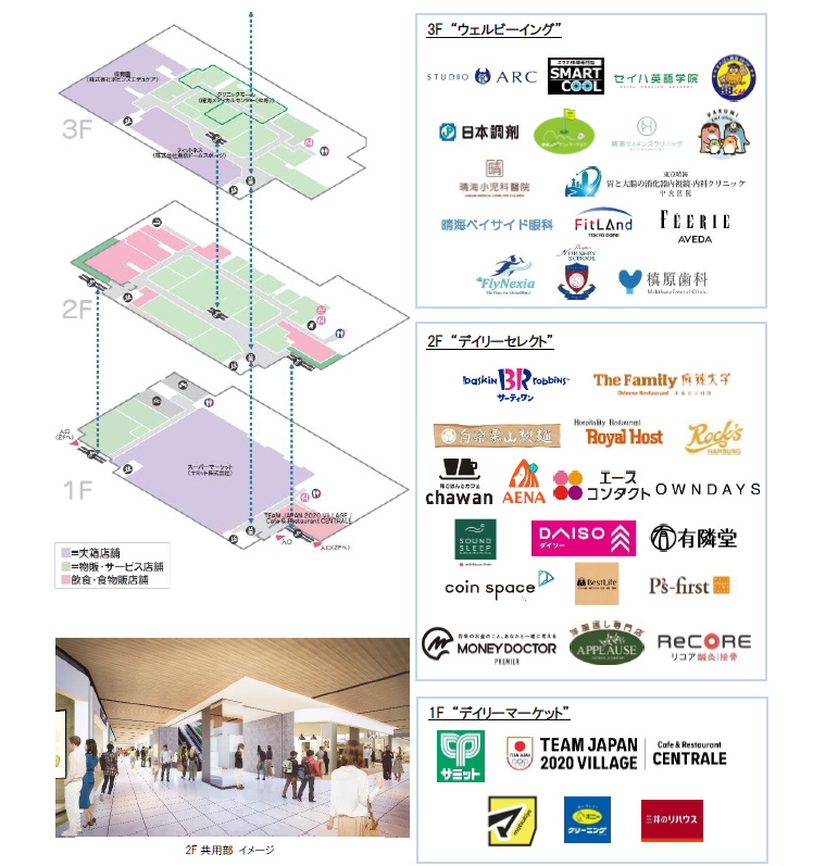 本施設内には、東京2020大会選手村でも提供された、GAP認証食材を活用する本格レストラン「TEAM JAPAN 2020 VILLAGE Cafe & Restaurant CENTRALE」をはじめ、地域住民の生活を支える39店舗のオープンを予定しており、“生活密着型施設”として、HARUMI FLAGエリアでの快適なライフスタイルを実現します。また、東京2020大会の歴史を伝えるスポーツピクトグラムのオブジェやアートウォール、人々の交流を創出するイベントスペース設置などを通じ、新しい街・晴海の地域交流の創出の場として地域社会に貢献します。