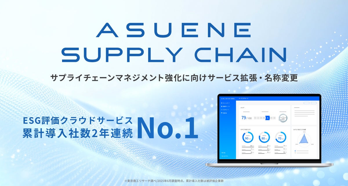 この2年連続の累計導入社数No.1獲得を節目として、当社は「ASUENE ESG」を拡張し、新たに「ASUENE SUPPLY CHAIN」としてサービスを進化させます。これにより、「ASUENE SUPPLY CHAIN」は複雑化するサプライチェーンマネジメントを一元管理できる新たなプラットフォームになります。