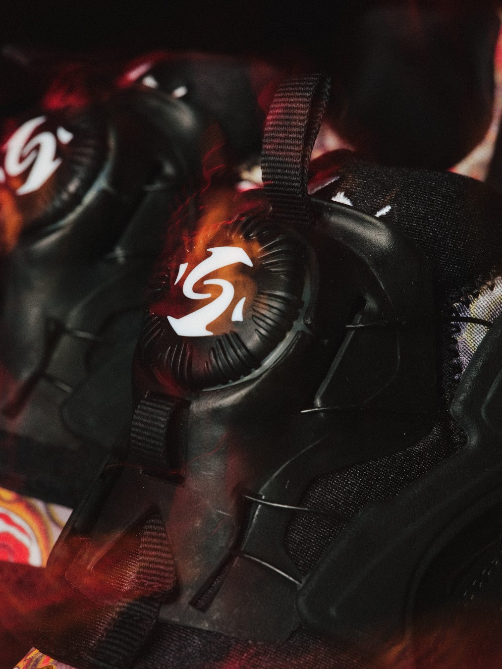 サイドのパネルは、ブラックカラーのクリアパーツを加え、象徴的なフォームストリップは上質なブラックレザーを使用。ソールは、全体を引き締めるホワイトカラーでアレンジしたことで、MUTSUOのアートワークを強調する個性派なDISC BLAZEにブラッシュアップしました。