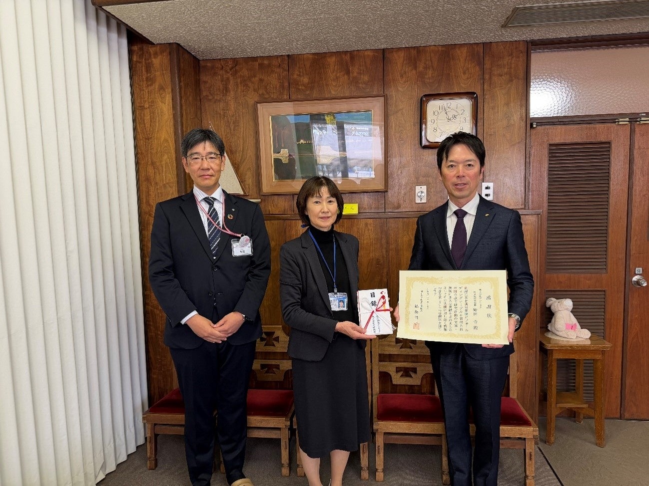 野田社長が鶴海園長に目録を手渡し、鶴海園長からは野田社長へ感謝状を贈られ、感謝の意を伝えられました。