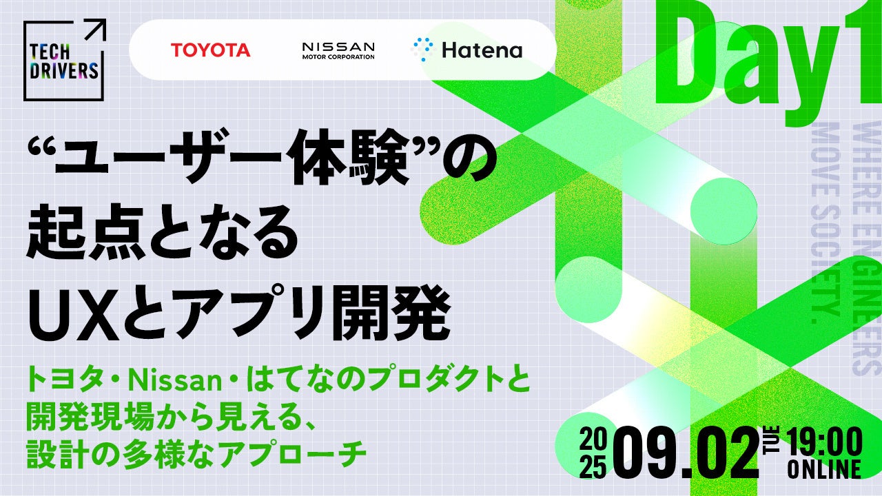 第1弾では、「UX設計とアプリ開発」をテーマに、トヨタ・Nissan・はてなの3社が登壇します。車載UX、コネクテッドアプリ、大規模Webサービスといった異なるプロダクトを開発する現場から、実際の制約や判断軸をふまえたユーザー体験設計のリアルを語ります。「UX設計」とひとことで言っても、たとえば乗員の安全性、スマートフォンとの連携、会員情報基盤との統合など、求められる視点や設計アプローチは大きく異なります。本イベントでは、それぞれの開発現場での試行錯誤を比較しながら、UXの本質に迫ります。