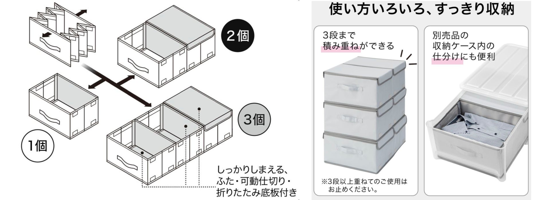広げて、畳んで、仕分けができる伸縮ボックスで、収納スペースを有効活用しませんか。