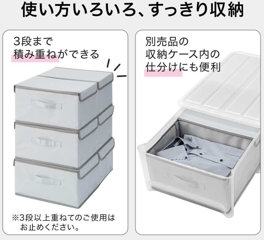 別売りの収納ケースに入れてご利用になると仕分けができて衣類の整理がより簡単になります。