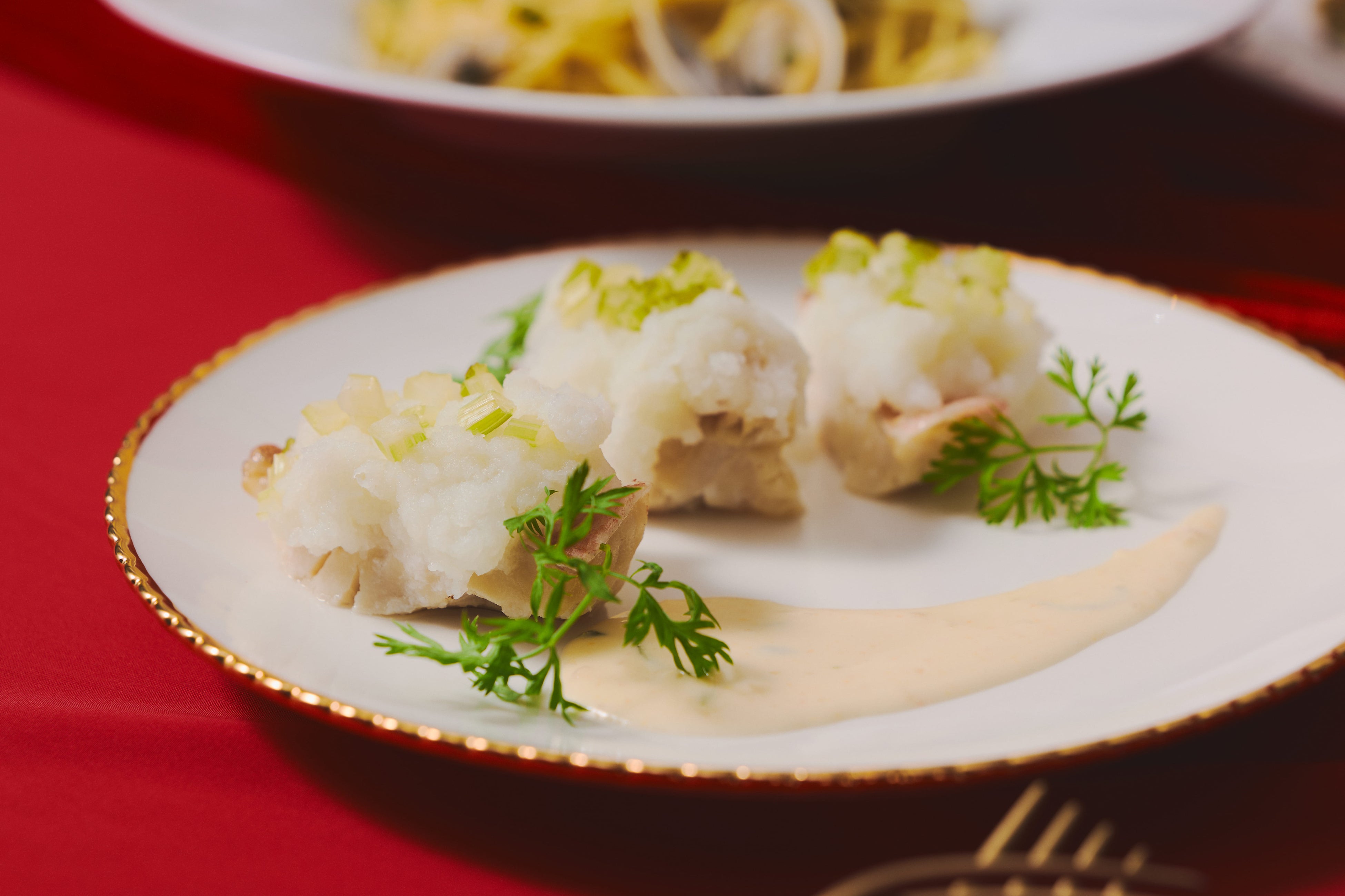 低温で時間をかけて丁寧にローストした和牛の塊肉を、シェフズコーナーでゲストの目の前でカットしてご提供。和牛ならではの豊かな旨味と芳醇な香りを逃さぬよう、しっとりと艶やかに仕上げました。玉ねぎの甘みとコクが凝縮されたシャリアピンソースとともにお召し上がりください。