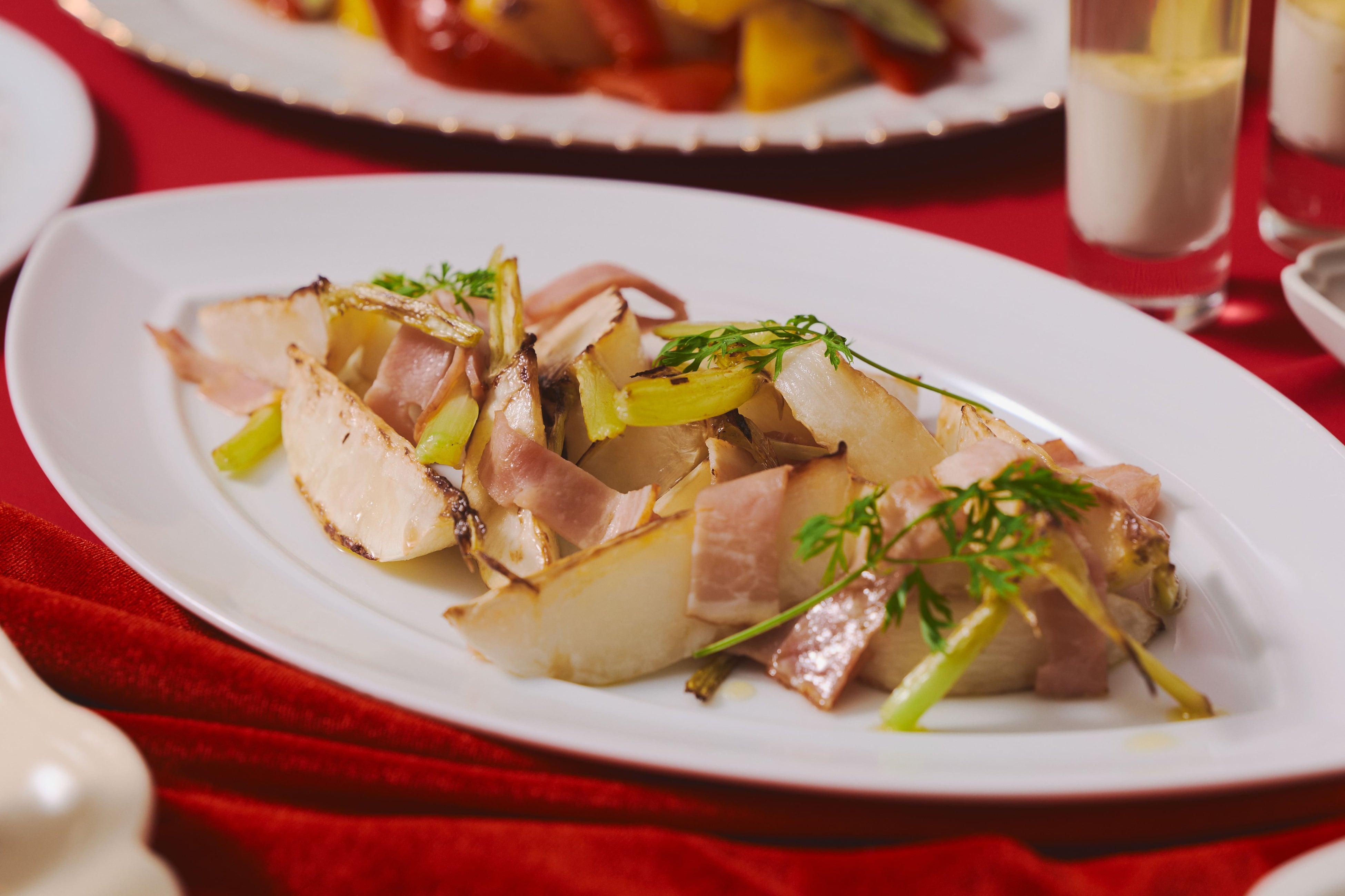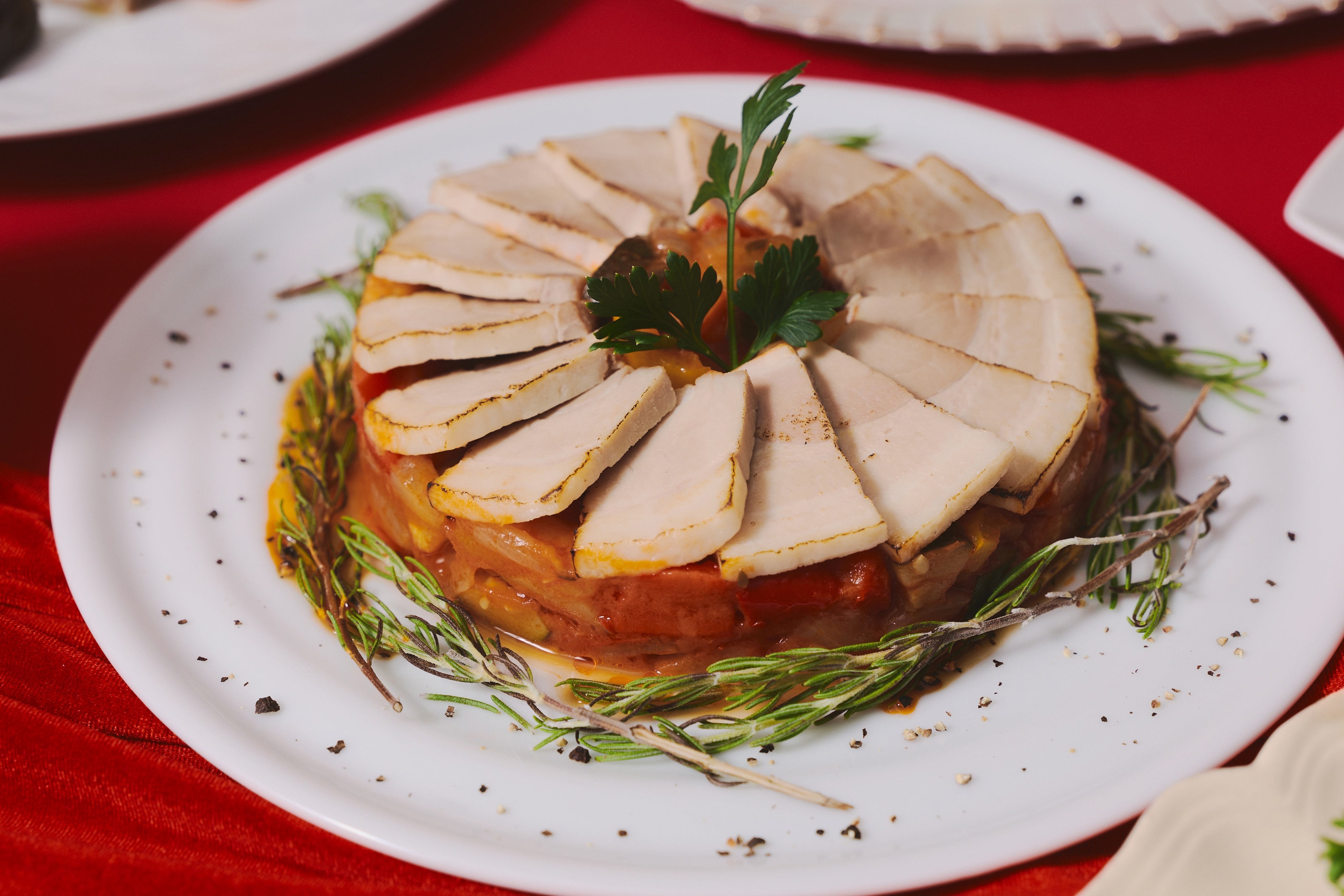 香草の香りを移したオイルで低温からじっくり加熱して肉本来の旨味を内側に閉じ込め、太陽をたっぷり浴びた野菜の甘みが凝縮されたシチリアの郷土料理「カポナータ」を合わせました。濃厚なコンフィと爽やかなカポナータが織りなす、味わいのコントラストが光る一品です。