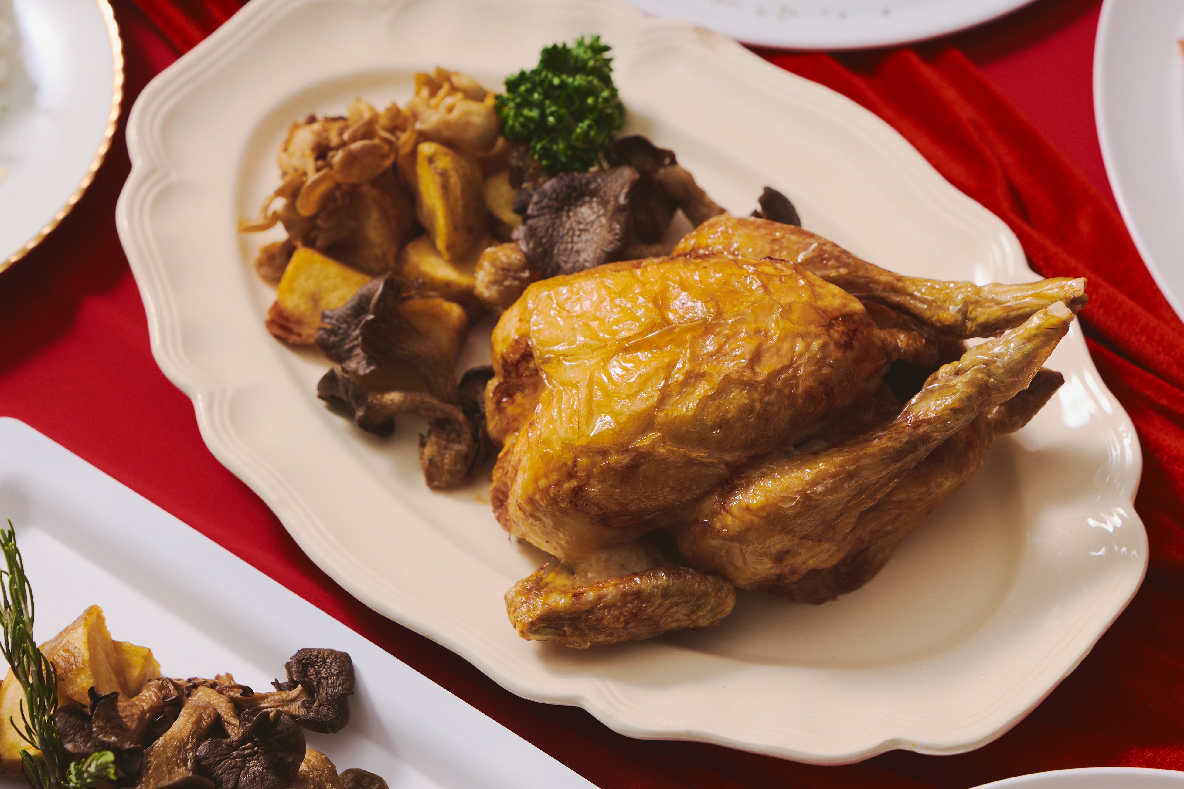 国産の丸鶏をじっくりと香ばしく焼き上げた、王道のローストチキンです。ローズマリーとタイムの爽やかな香りで鶏肉の旨味を引き立たせ、皮はパリッと、中はしっとりジューシーに仕上げました。