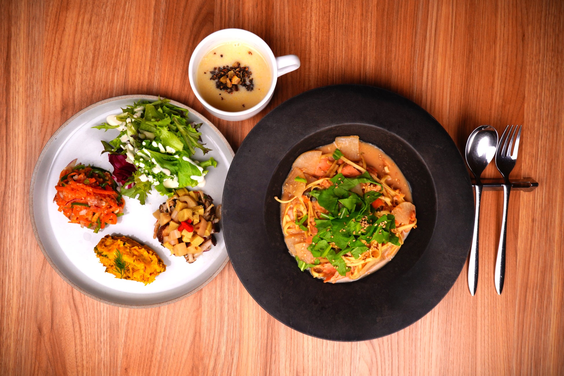秋鮭と大根をやさしい味噌クリームで仕立て、「アーモンド効果®<砂糖不使用>」を使うことでコクと栄養を両立。SUNAOもっちりパスタを使用することで糖質を抑えながら、ソースとの相性もよく、もっちりとした食感でおいしさも両立。また、大阪産ルッコラにより、さわやかな香りとほのかな苦味が濃厚ソースを引き締めます。植物性素材のコクと鮭の旨みが溶け合う、身体想いの一皿。