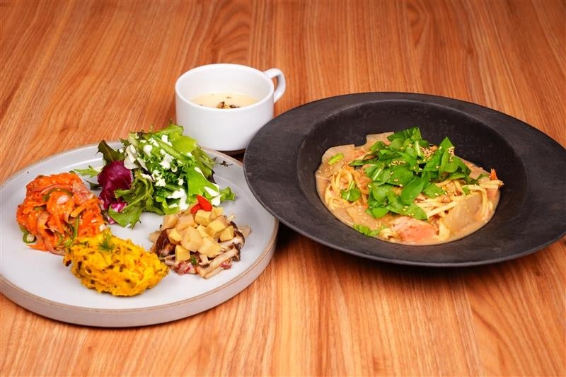 「秋鮭と大阪産ルッコラのSUNAOもっちりパスタ・季節のデリセット」の提供