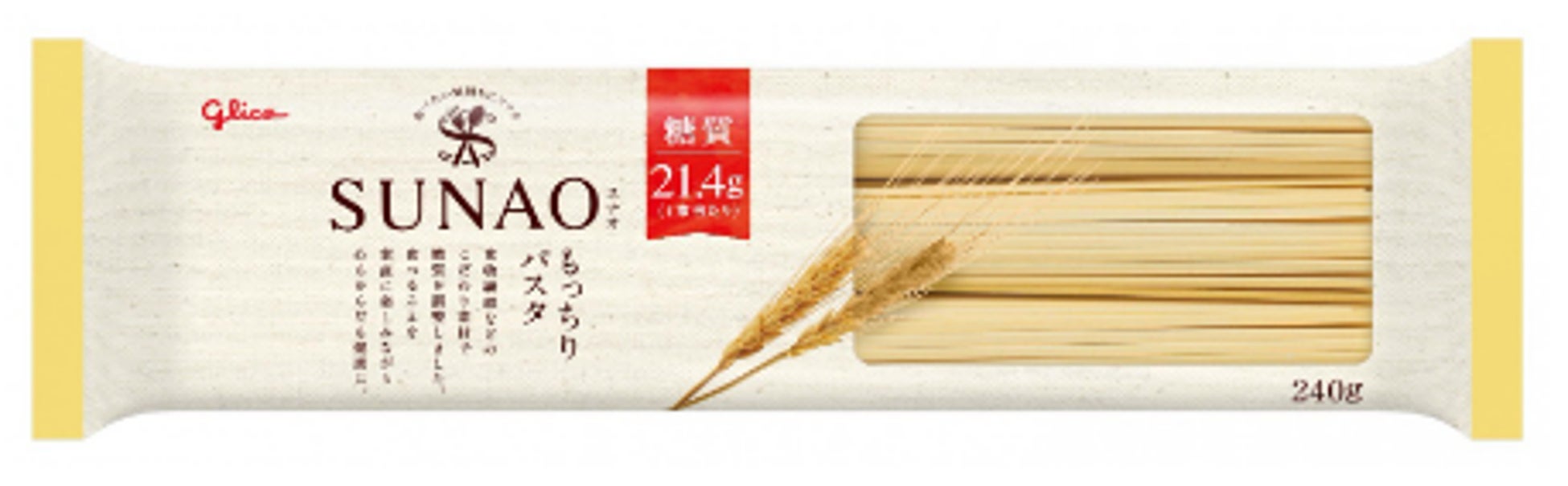 「SUNAO」は、お客様がからだに気を配りながら、100%食べることを楽しむために生まれたブランドです。「おいしさ」と「適正糖質」を両立する商品として2017年にアイス、2018年にビスケット、2022年2月より「SUNAOもっちりパスタ」を発売。パスタ本来のおいしさを損なわず、もっちりとした食感にするために、もち大麦粉を使用して実現しました。平打ち麺にすることでソースがよく絡む味わい深いパスタに。そしてこの食べごたえで糖質量1食21.4gまで調整しました。