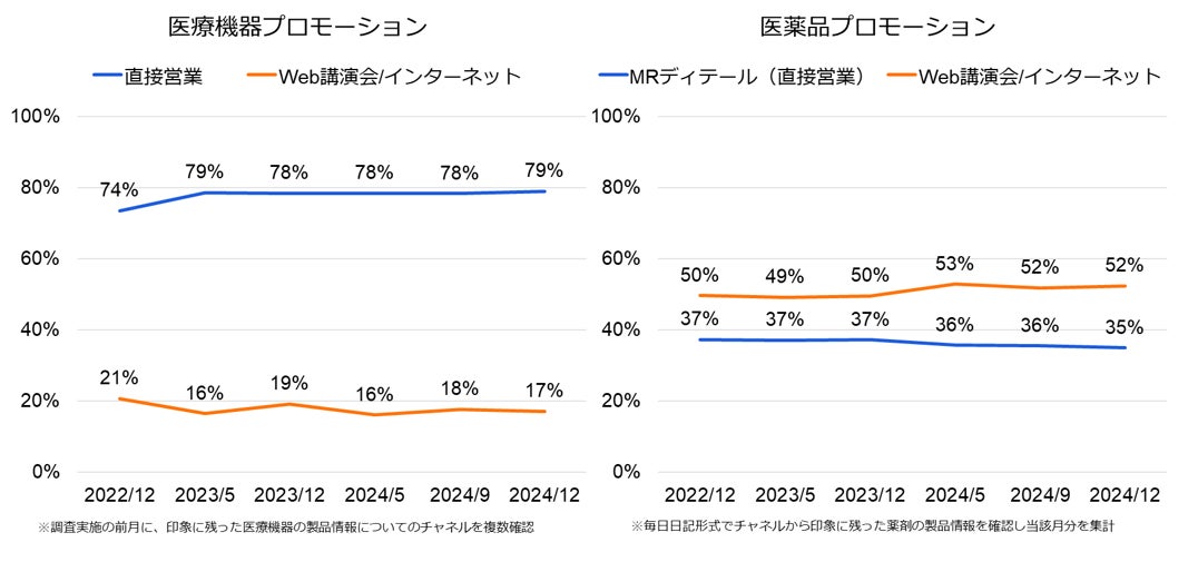 また、「製薬企業のプロモーション活動」を日記形式で確認している調査Impact Track(※2)においても、今回の医療機器の調査対象セグメント(6診療科・200床以上)に合わせて算出したところ、「医療機器の製品情報の入手状況」同様、2024年9月の調査と比較して大幅な増減は無いものの、「MRディテール(直接営業)」は減少傾向がみられました。
