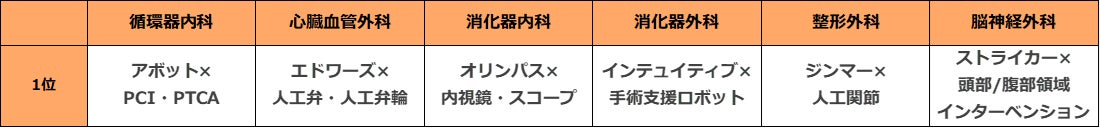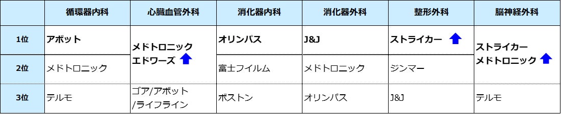 医師の印象に残っている医療機器メーカーのランキング(※1)では、「整形外科」の1位のメーカーが前回調査から変化。