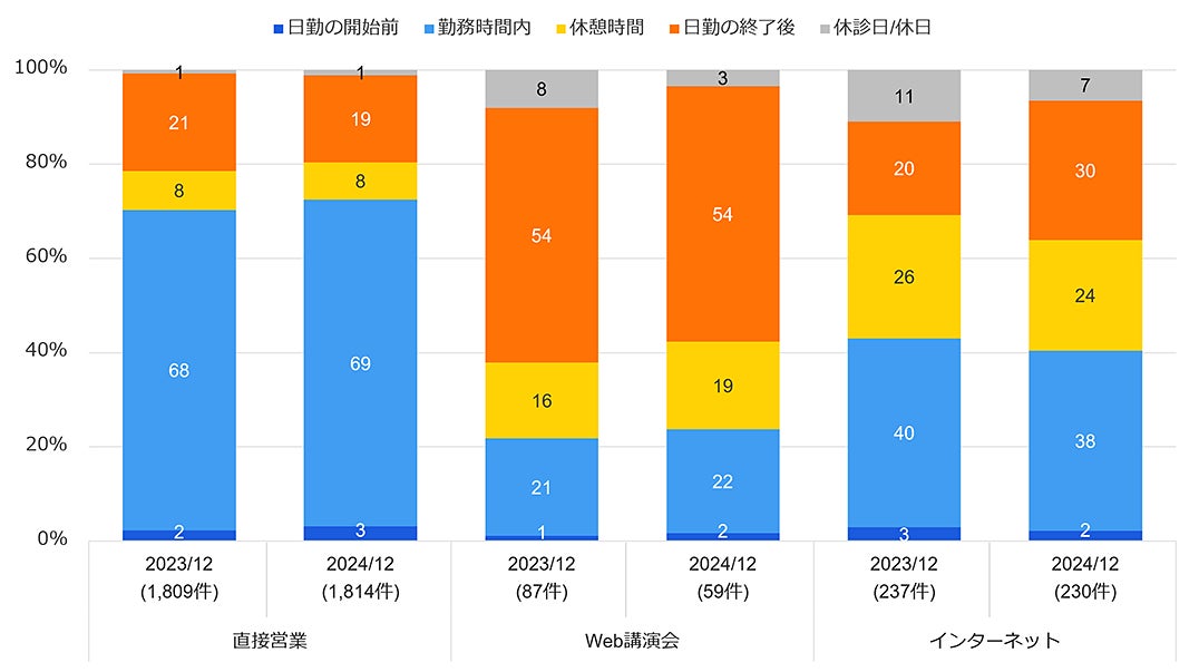 医師が情報を入手するチャネルごとの時間帯を確認したところ、「直接営業」は「勤務時間内」が約7割と、2023年12月の調査と比較して、変化はありませんでした。一方、「インターネット」は2023年12月の調査と比較して「日勤の終了後」の割合が10ポイント増加しました。