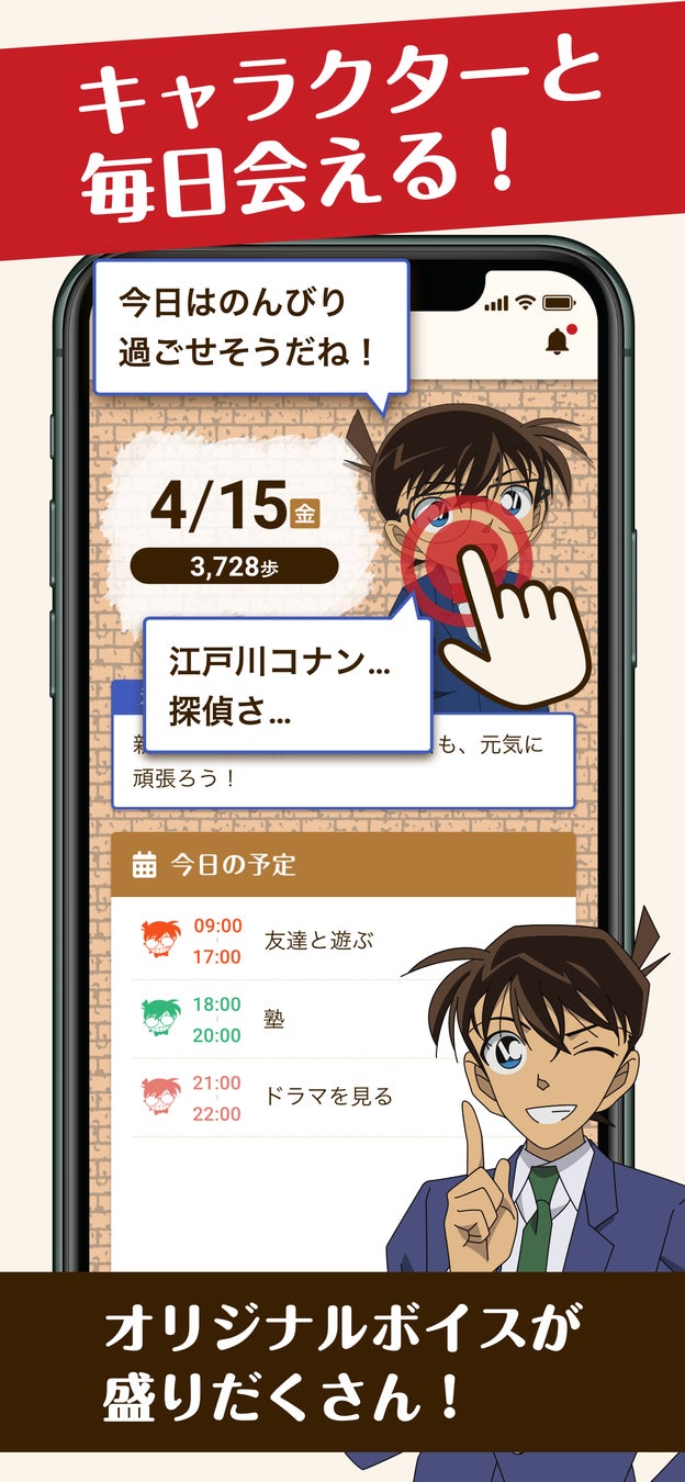 本アプリは、人気アニメ「名探偵コナン」に登場するキャラクターたちと一緒に、日々の予定を管理できる「カレンダー」機能と、自身のスマートフォン上にキャラクターのウィジェットを配置することのできる「ウィジェット」機能を兼ね備えたツールアプリです。