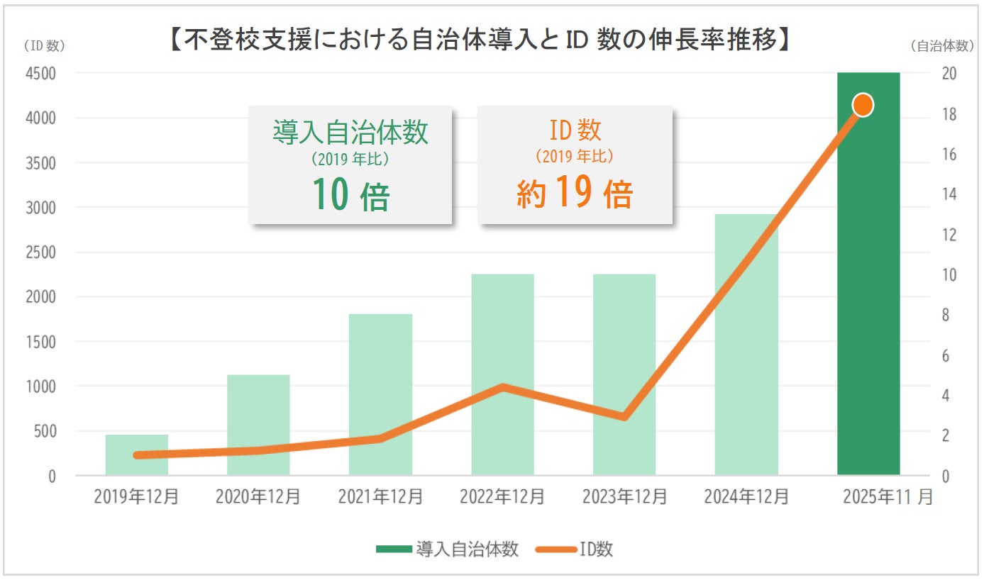AIを活用したアダプティブな対話式 ICT 教材の開発と提供を行う株式会社すららネット(本社:東京都千代田区、代表取締役:湯野川孝彦)が提供するアダプティブICT教材「すらら」は、不登校児童生徒の学習支援を目的とした自治体での導入が、2025年11月末時点で過去最高を更新しました。自治体で「すらら」が初めて導入された2019年と比較して、導入自治体数は10倍の20自治体、ID数は約19倍の4,219IDとなりました。学習成果と活用実績が教育現場で高く評価され、導入の動きが政令指定都市を含め全国に広がっています。