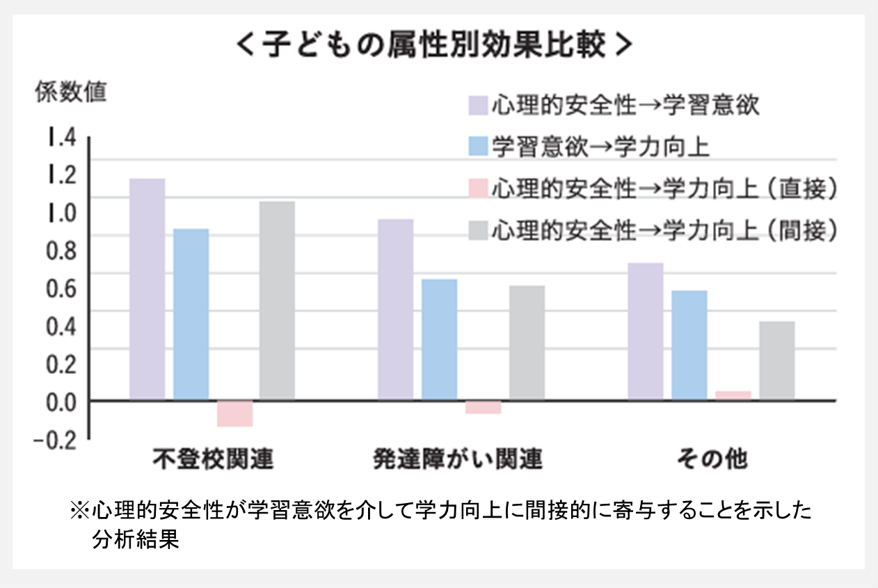 「すらら」の教育効果については統計的な検証も進んでいます。すららネット「インパクトマネジメントレポート2024※」では、共分散構造分析を用いた調査により、心理的に安心できる環境が学習意欲を高め、その意欲が学力向上につながるという間接的な効果が明らかになりました。特に不登校や発達障がいなど特別な支援を必要とする子どもにとって、心理的安全性の確保が学びの成果を生む前提条件であることが示されています。