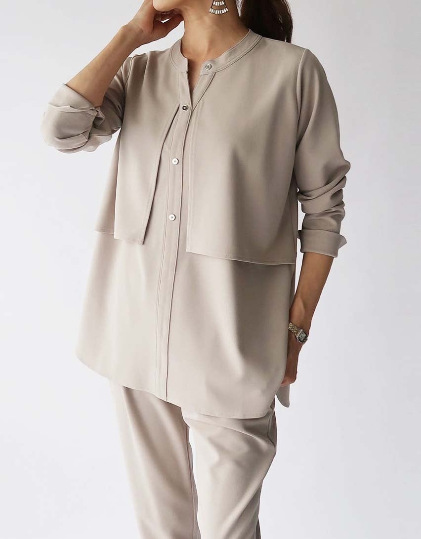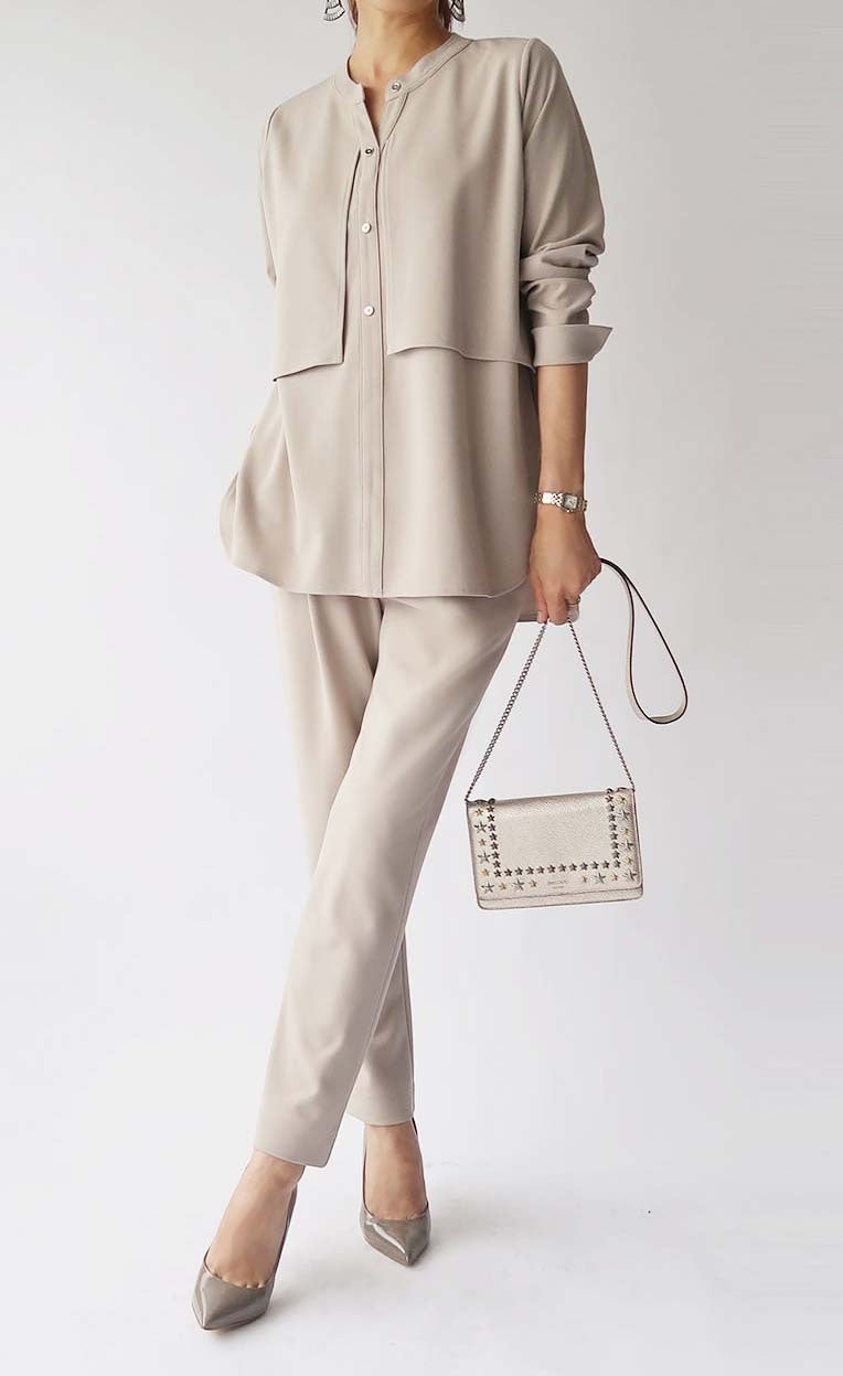 重ね着のように見える2枚仕立てのデザインがポイント。