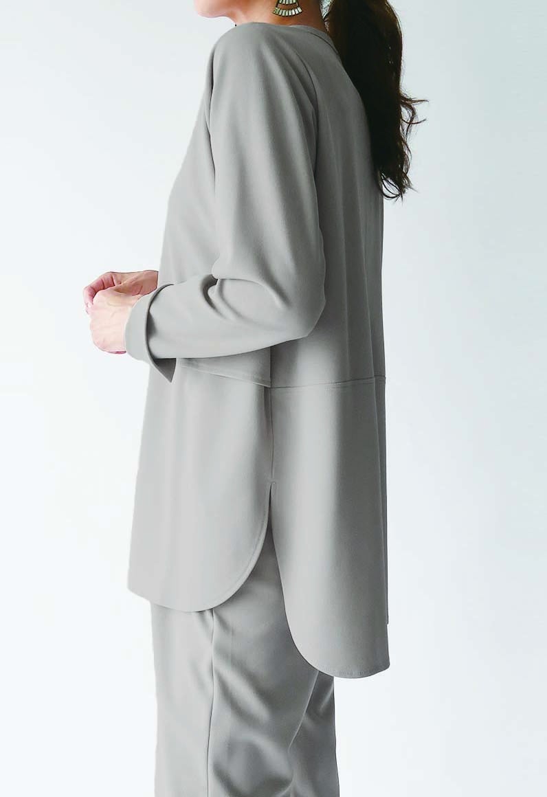 裾が広がるフレアーシルエット。長めの後ろ丈でよりフェミニンに。