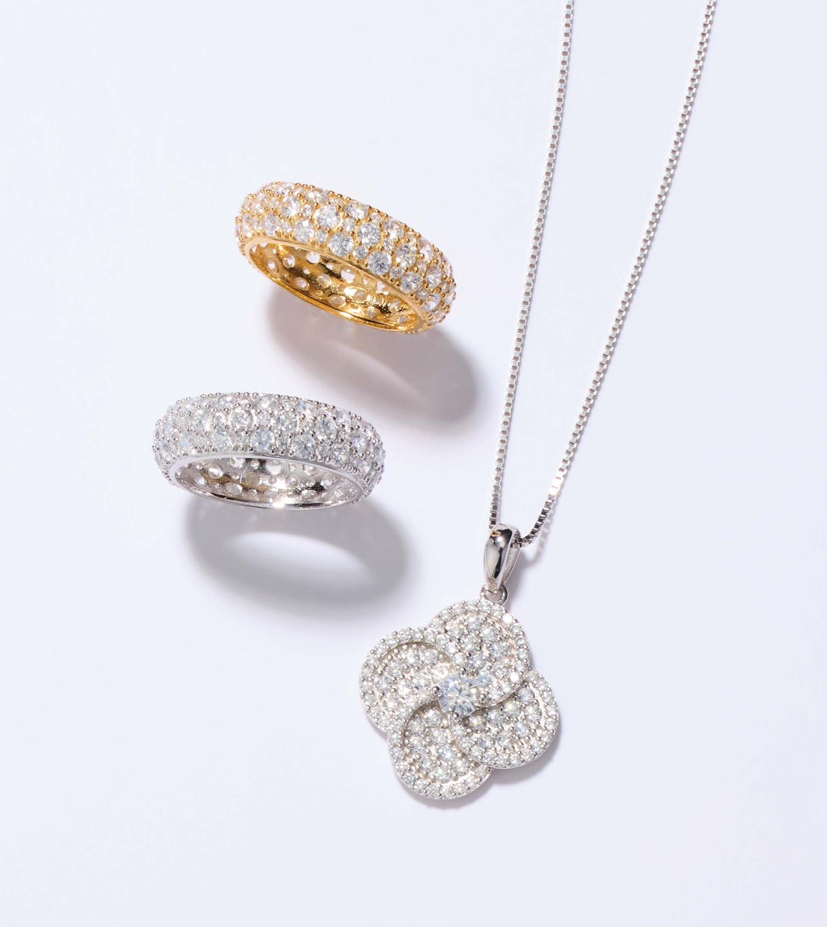存在感のあるリングや四つ葉のクローバーのペンダントトップなど、キュービックジルコニア(CZ)の輝きが冴えるジュエリーをご紹介します。