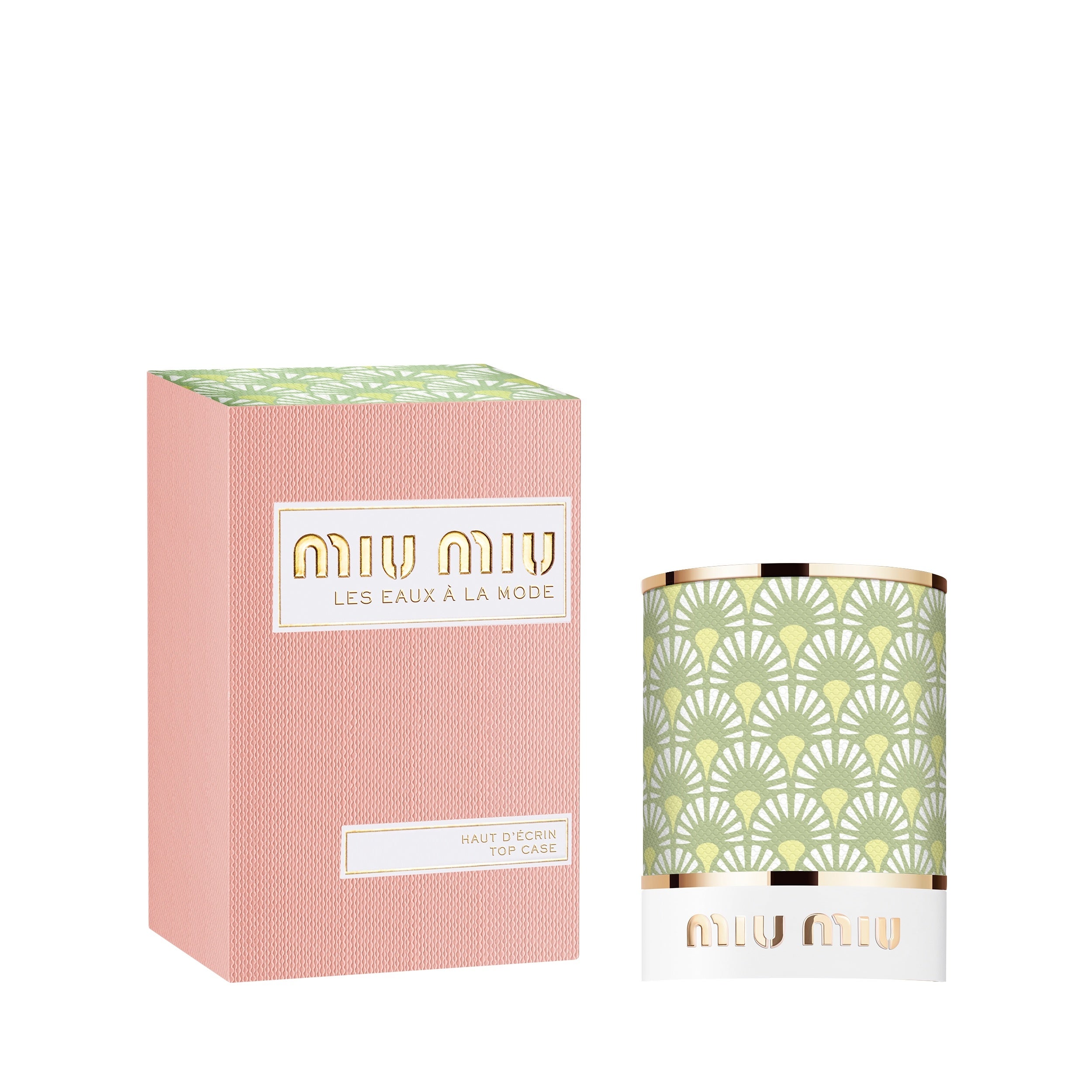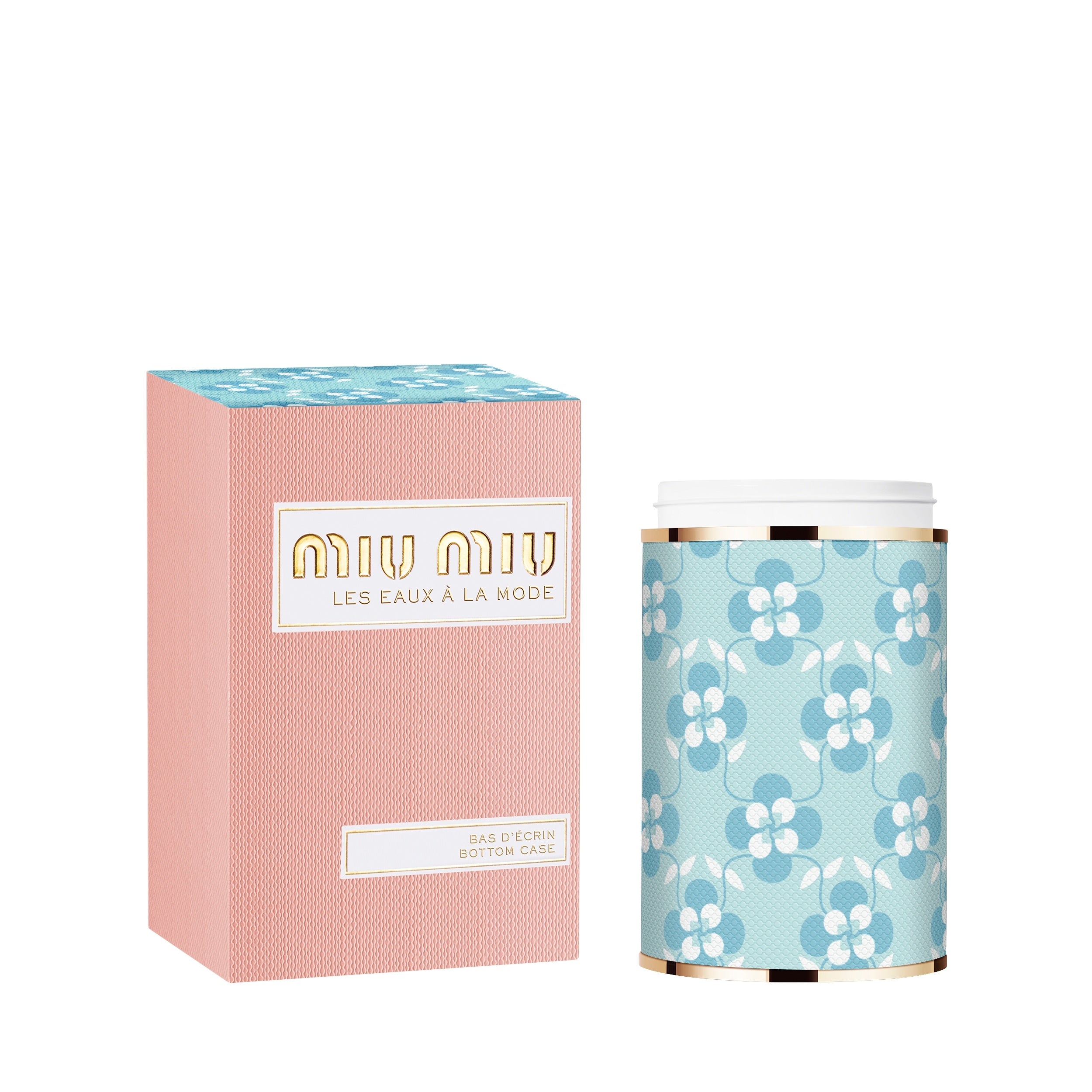 「レ ゾー アラモード」のワードローブを彩るパッケージにも新しくミュウミュウを象徴する2つのプリントが加わりました。トップケースは2016年の春夏コレクションにインスパイアされたグリーンのアールデコ調プリント。ボトムケースは2017年秋冬コレクションに由来するポップアート調のブルーとホワイトの花柄。それぞれのケースが、気まぐれな対比を見せてくれます。