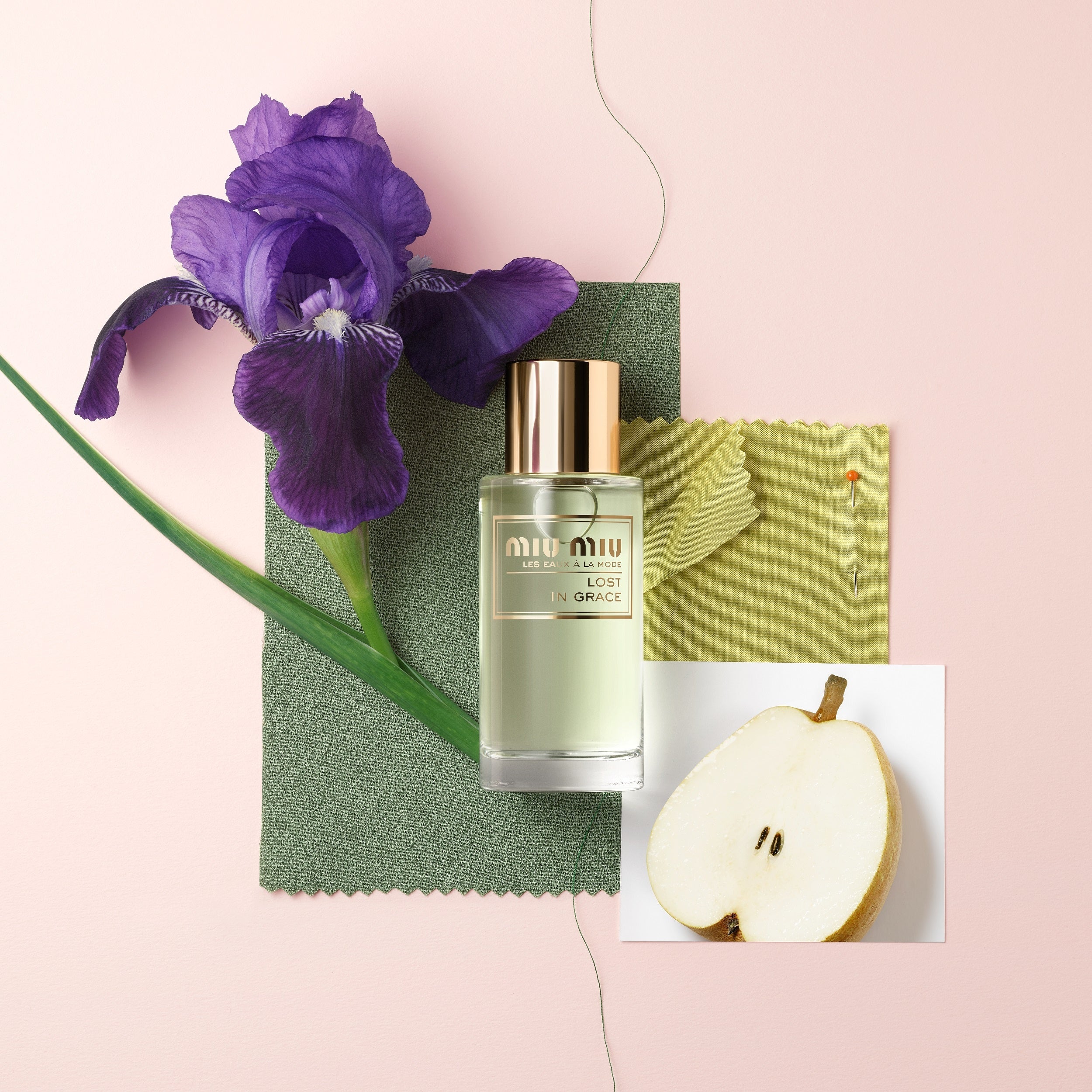 「ロストイングレース」は、ミュウミュウと長年コラボレーションを続けてきたスターパフューマ―のダニエラ・アンドリエが調合。「レ ゾー アラモード」コレクション初のパウダリーフローラルの香りです。みずみずしい洋梨のアコードの明るくモダンな香りから、優美なアイリスのミドルノートへ。トップノートの新鮮でフルーティな香りとは対照的に、柔らかで包み込むようなミドルノートは、なめらかなシダーウッドのラストノートへと昇華します。