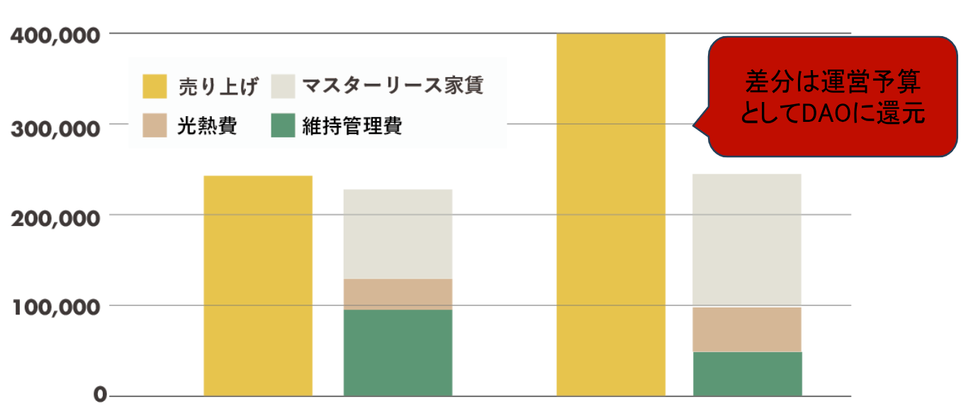 DAO導入前は赤字物件だったため、ギリギリの収支を予想していたが、DAO導入でのシェアハウスの魅 力向上により売上が 1.7 倍に伸⻑したにもかかわらず、費用面でも DAO導入による自律的運営の促進が 維持管理費を大きく抑制。