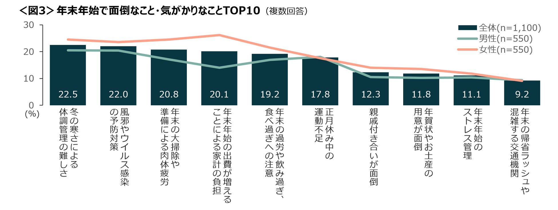 女性の方が面倒・気がかりに感じている項目が多く、特に「年末の大掃除や準備による肉体疲労」「年末の出費が増えることによる家計の負担」は男性との差が大きい。<図3>