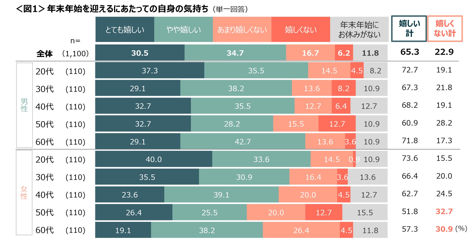 年末年始を迎えるのが「嬉しい」と回答した人は65.3%。