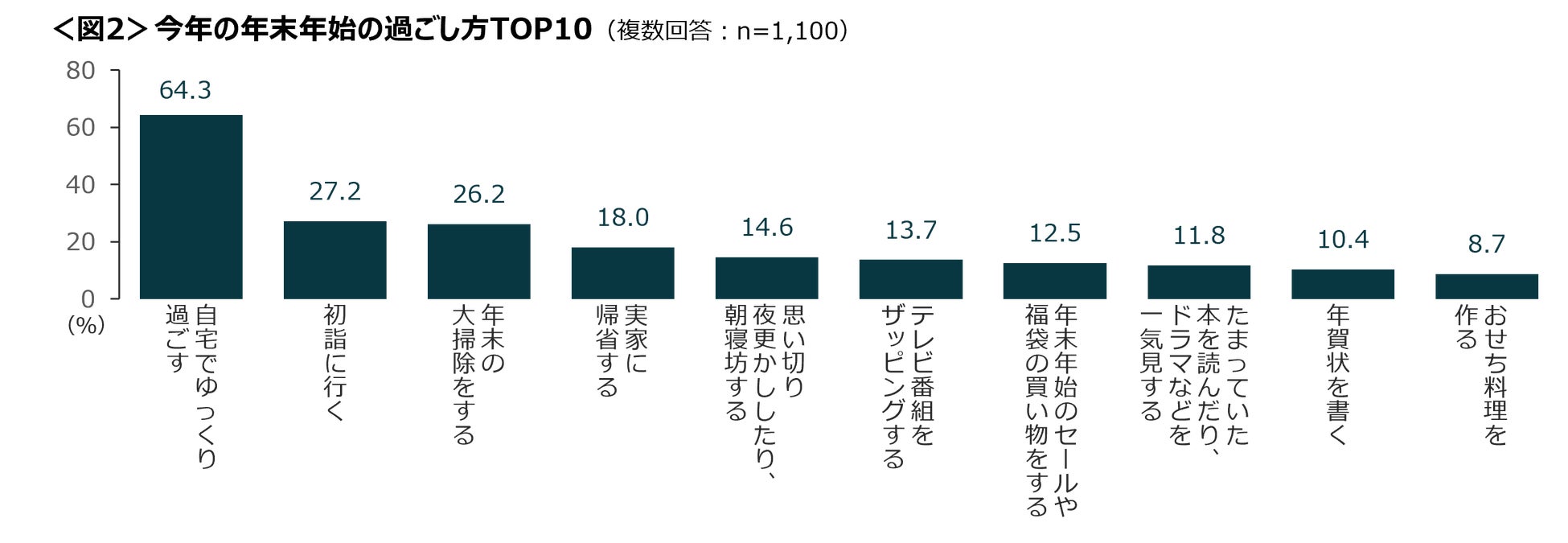 年末年始の過ごし方は「自宅でゆっくり過ごす」が64.3%で断トツ。「初詣に行く」「年末の大掃除をする」が2割台で続く。<図2>