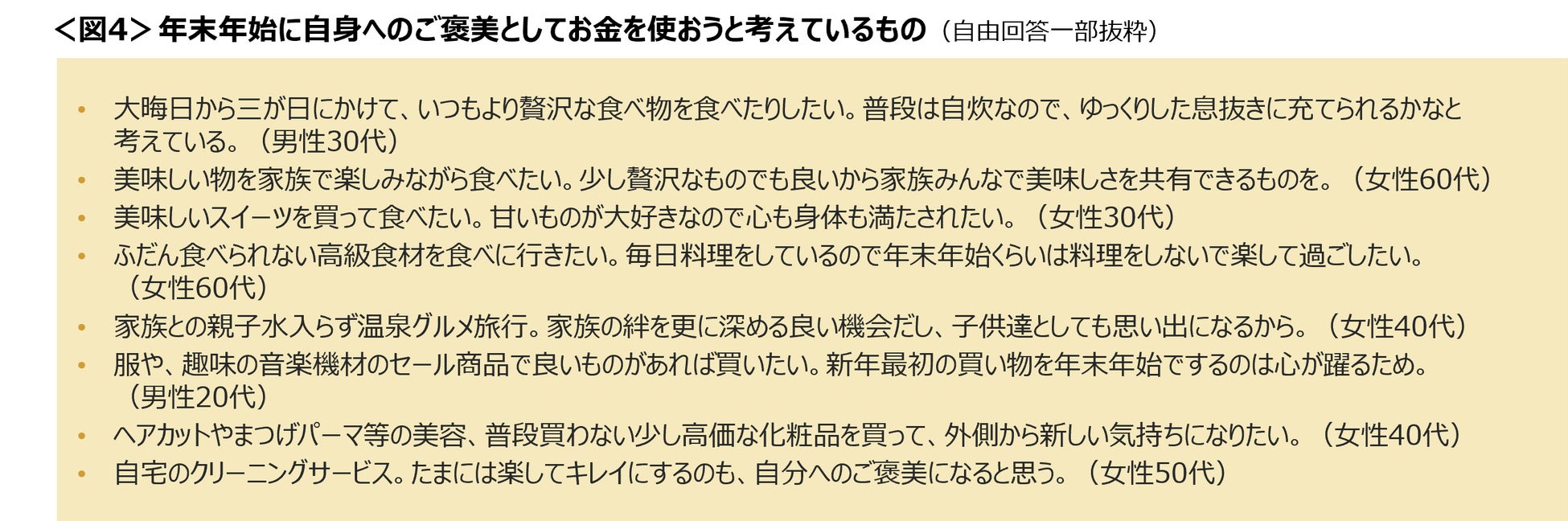 年末年始のご褒美としてお金を使いたいものは、いつもより贅沢な食事や普段は買わない高級食材などがあげられた。理由としては「ゆっくりと息抜きをしたい」「楽して過ごしたい」「心も身体も満たされたい」といった声がみられた。<図4>