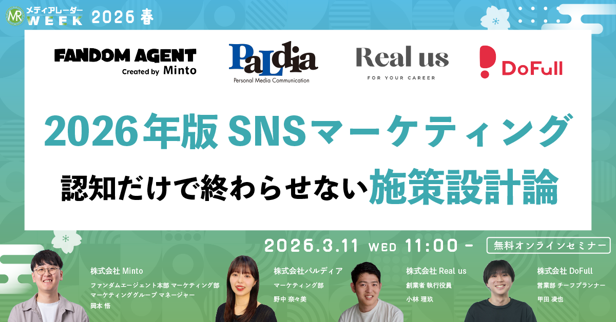 株式会社アイズ(所在地:東京都渋谷区、代表取締役社長:福島範幸、東証グロース:5242)が運営するNo.1*の広告業界のプラットフォーム「メディアレーダー」が主催するマーケティングセミナーイベント「第21回メディアレーダーWEEK 2026 春」にて、SNSマーケティングの専門家たちが3/11(水)に登壇します。視聴申し込みは無料です。