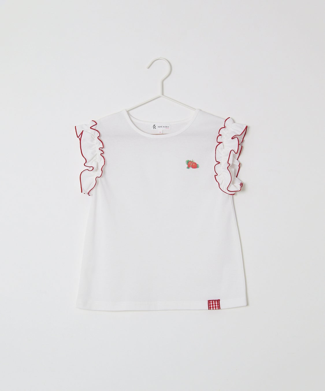 キッズのコラボTシャツは胸元に「Bonne Maman(ボンヌママン)」のフルーツの刺繍が施されています。袖のフリルもとてもキュート。