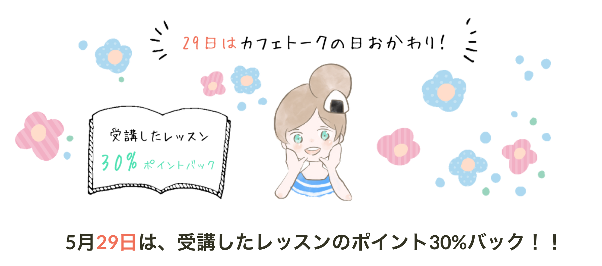 5月29日にカフェトークのオンラインレッスンを受講すると、後日30%ポイントが戻る!